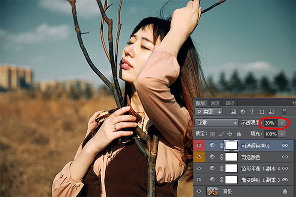 4、按Ctrl + J 把当前可选颜色调整图层复制一层,不透明度改为:30%,如下图。
