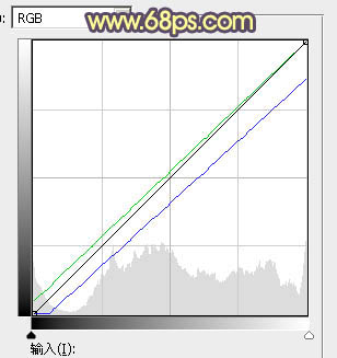 8、创建曲线调整图层,对RGB及蓝色通道进行调整,参数及效果如下图。这一步把图片暗部颜色稍微加深。