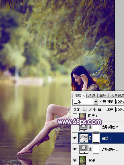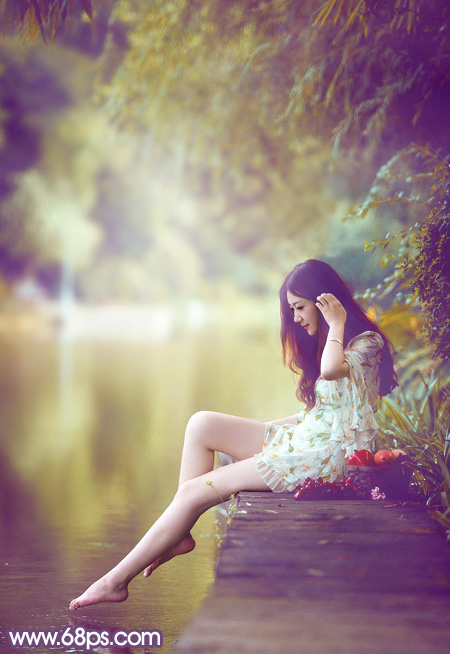 素材图片以绿色为主,调色的时候可以直接把绿色转为橙黄色得到初步的主色,然后给高光部分增加一点淡蓝色,暗部增加一点蓝紫色增强层次感即可。