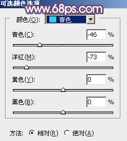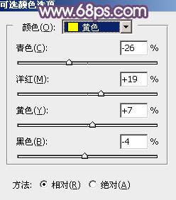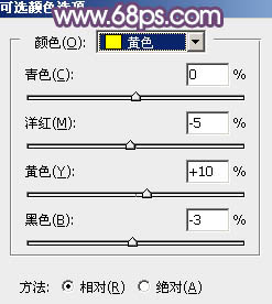 15、创建可选颜色调整图层,对黄色进行调整,参数及效果如下图。这一步给图片增加淡黄色。