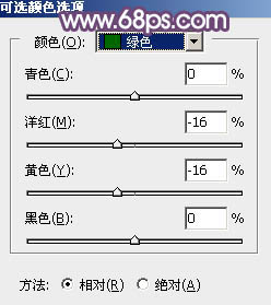 3、创建可选颜色调整图层,对黄、绿、白、黑进行调整,参数设置如图11 - 14,效果如图15。这一步给图片增加橙黄色。