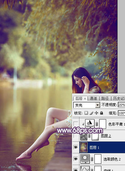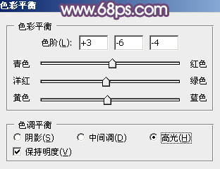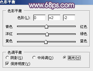 7、创建色彩平衡调整图层,对阴影,高光进行调整,参数及效果如下图。这一步给图片增加淡黄色。