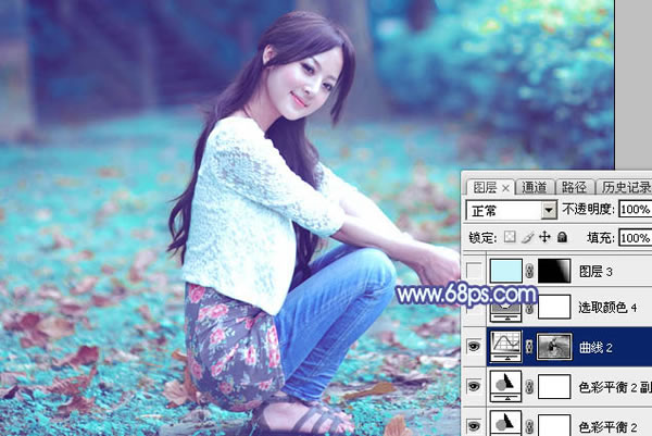 素材图片主色为黄绿色,调色的时候把黄色部分转为中性色,绿色转为青色;然后把整体颜色稍微调淡,暗部增加一点蓝色即可。