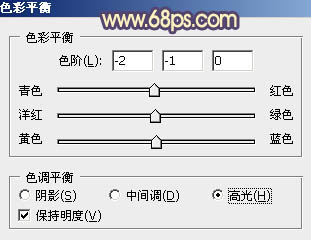 6、按Ctrl + Alt + 2 载入高光选区,按Ctrl + Shift + I 反选得到暗部选区。创建色彩平衡调整图层,对阴影,高光进行调整,参数及效果如下图。这一步给图片暗部增加蓝色。