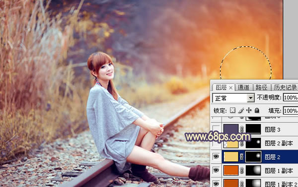 10、创建纯色调整图层,颜色设置为橙黄色:#F3CE73,确定后把蒙版填充黑色,用白色画笔把下图选区部分擦出来。这一步给高光区域中心增加高光。