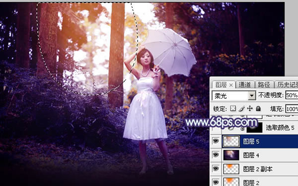 14、用套索工具选取下图所示的选区,羽化40个像素后按Ctrl + J把选区部分的图像复制到新的图层,不透明度改为:50%,效果如下图。