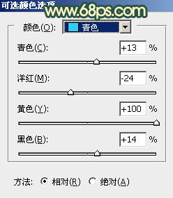 素材图片主色为黄绿色,不过黄绿色色差不是很大;调色的时候需要耐心一点,用可选颜色逐步把黄绿色分开,黄色转为橙黄色,绿色转为暗青色;再渲染一下高光及暗部即可。