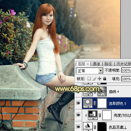 2、创建可选颜色调整图层,对黄色,绿色进行调整,参数及效果如下图。这一步主要把图片中的黄色转为橙红色。