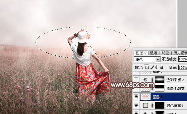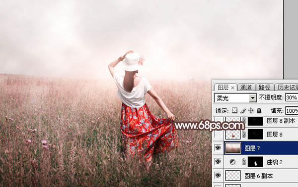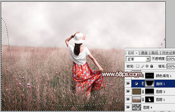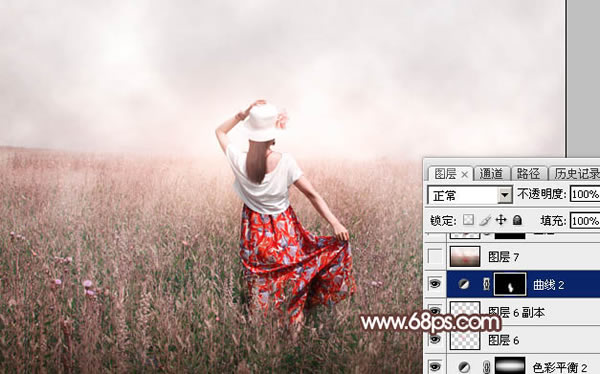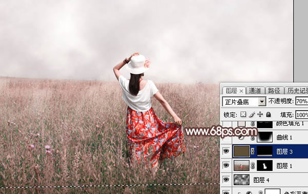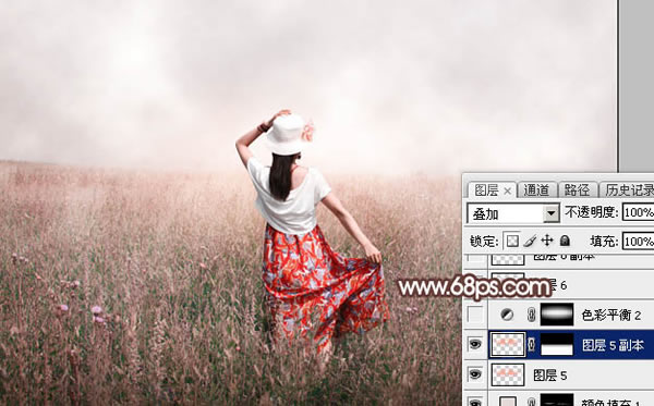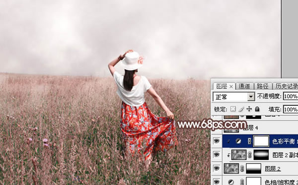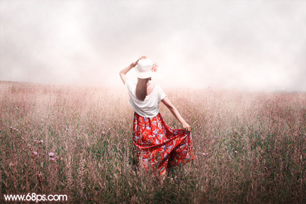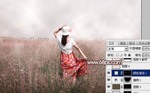 11、创建纯色调整图层,颜色设置为淡红色:#E3DAD8,确定后把蒙版填充黑色,用透明度为5%左右的白色画笔涂抹与天空交接的草地部分,增加梦幻感觉。