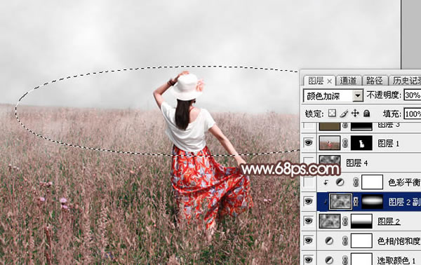 6、按Ctrl + J 把当前云彩图层复制一层,按Ctrl + Alt + G 创建剪切蒙版。然后把蒙版填充黑色,用椭圆选框工具拉出下图所示的选区,羽化60个像素后填充白色。再把混合模式改为“颜色加深”,不透明度改为:30%,如下图。