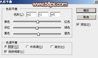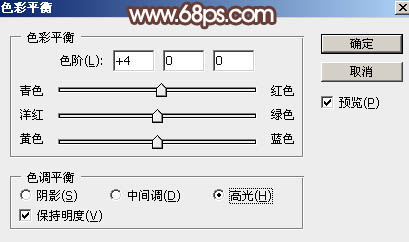 14、创建色彩平衡调整图层,对阴影,高光进行调整,参数设置如图22,23,确定后把蒙版填充黑色,用白色画笔把中间区域擦出来,效果如图24。这一步给图片中间区域增加淡红色。