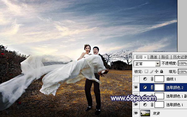 素材图片拍摄的比较暗,不过人物部分不够突出。调色的时候给暗部多增加一点蓝色,草地颜色转为橙红色,得到初步的秋季效果;然后单独把人物部分调亮,肤色调红润,局部再增加高光和暗角即可。