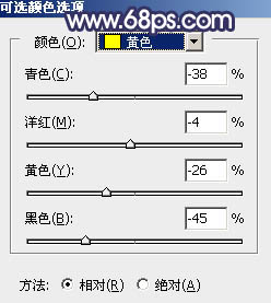 3、创建可选颜色调整图层,对黄色,绿色进行调整,参数及效果如下图。这一步主要把草地颜色转为橙黄色。