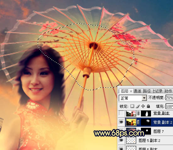 16、把背景图层复制一层,按Ctrl + Shift + ] 置顶,按住ALt键添加图层蒙版,用白色画笔把伞内部需要增加细节的部分擦出来,然后用色彩平衡调整一下颜色,效果如下图。