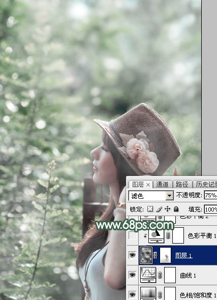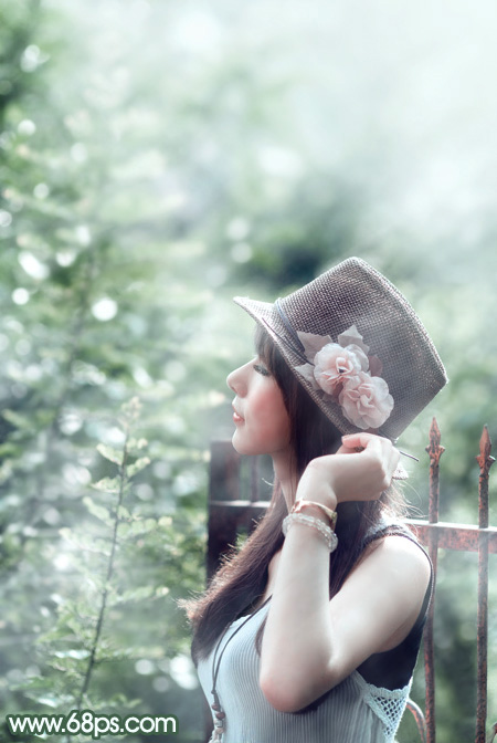 素材图片主色为黄绿色,调色的时候先把主色调成绿色;然后降低饱和度得到教暗的中性绿色;再用云彩纹理叠加做出梦幻效果;后期给高光区域增加淡青色,整体柔化处理即可。