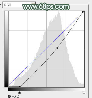 5、创建曲线调整图层,对RGB,蓝通道进行调整,参数及效果如下图。这一步主要把图片颜色调暗一点。