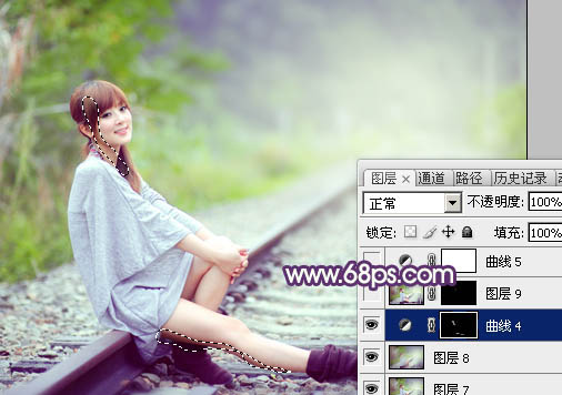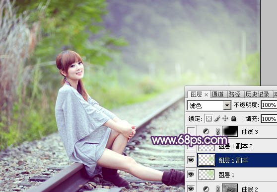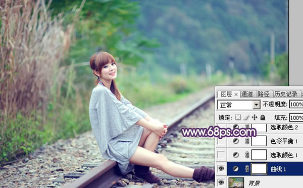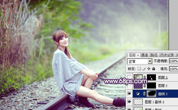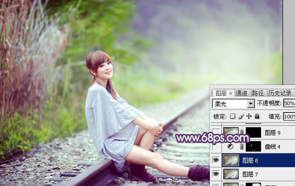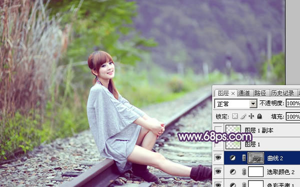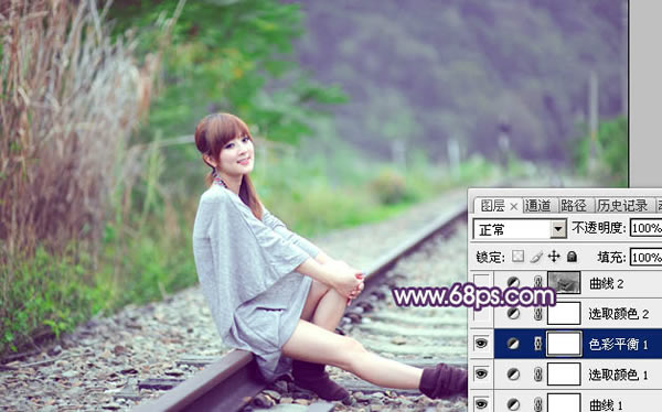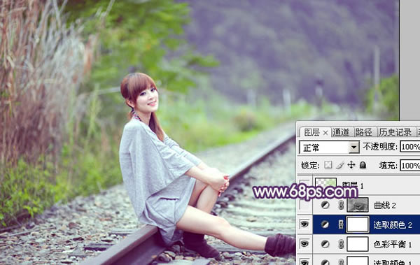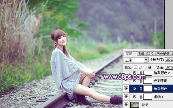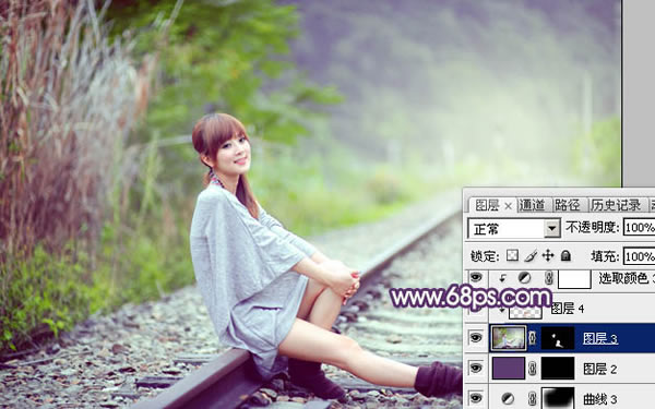 素材图片颜色有点杂乱,调色的时候可以把青色及暗部颜色转为蓝紫色;绿色转为黄绿色;然后把整体颜色稍微调淡,局部渲染一些柔和的高光即可。