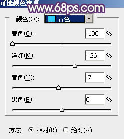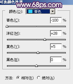 2、创建可选颜色调整图层,对红、黄、绿、青、白、蓝、黑进行调整,参数设置如图3 - 9,效果如图10。这一步主要把图片中的青蓝色转为蓝紫色,高光部分增加淡青色。