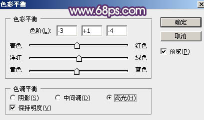 3、创建色彩平衡调整图层,对阴影,高光进行调整,参数及效果如下图。这一步主要加强高光亮度。