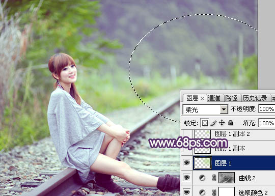 6、新建一个图层,用椭圆选框工具拉出下图所示的选区,羽化65个像素后填充淡绿色:#BCDE99,取消选区后把混合模式改为“柔光”,效果如下图。