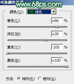 3、创建可选颜色调整图层,对黄色,绿色进行调整,参数设置如图4,5,效果如图6。这一步给图片增加橙黄色。