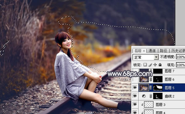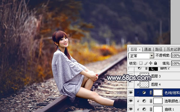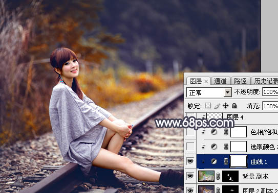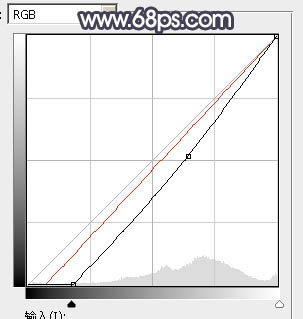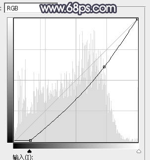 15、创建曲线调整图层,把全图压暗一点,参数设置如图32,确定后把蒙版填充黑色,然后用透明度较低柔边白色画笔把人物背光区域擦出来,效果如图33。