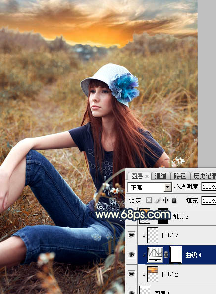 素材图片天空泛白,画面不够唯美。处理的时候先把主色转为暖色;然后把天空换成霞光素材;再把整体调暗,局部渲染一下高光;最后把整体柔化处理即可。