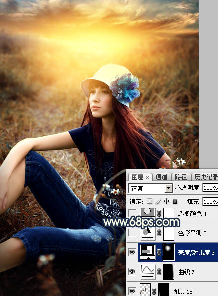 22、创建亮度对比度调整图层,适当增加对比度,参数设置如图37,确定后把蒙版填充黑色,然后用柔边白色画笔把中间区域擦出来,如图38。