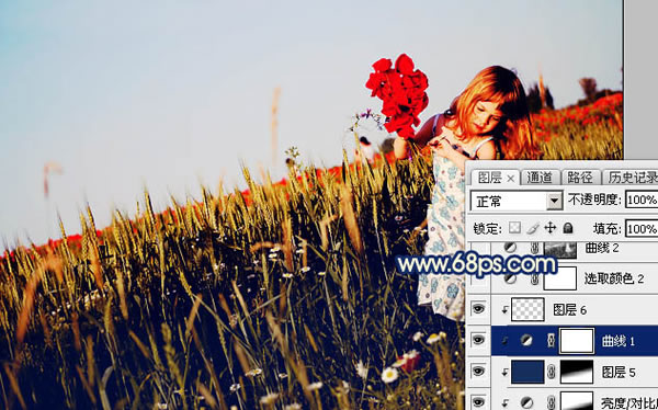 9、创建曲线调整图层,对RGB,蓝通道进行调整,参数设置如图25,确定后把蒙版填充黑色,然后用柔边白色画笔把右下角区域擦出来,效果如图26。这一步给底部区域增加暗角。