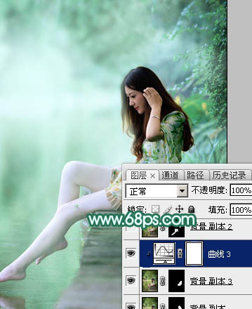 素材图片主色为黄绿色。调色的时候把黄色转为淡青色,绿色转为稍亮的青绿色;然后用云彩叠加增加烟雾效果;再单独调整一下人物颜色,局部渲染一些高光增加唯美感即可。
