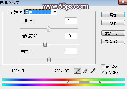 8、创建色相/饱和度调整图层,对黄色进行调整,适当降低饱和度,参数设置如图13,确定后创建剪切蒙版,效果如图14。