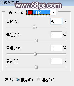 9、创建可选颜色调整图层,对红色,白色进行调整,参数设置如图15,16,确定后创建剪切蒙版,效果如图17。这一步微调人物肤色。