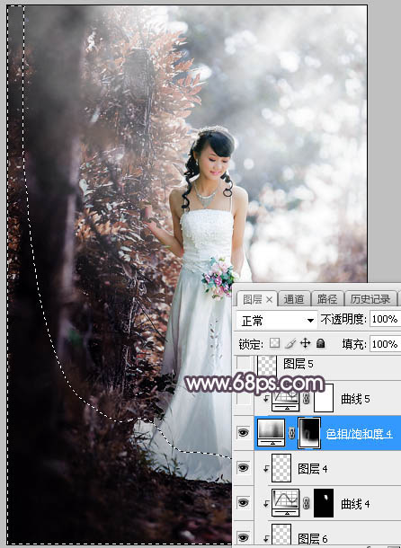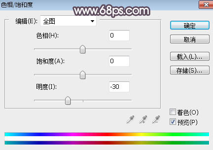 13、创建色相/饱和度调整图层,降低全图明度,参数设置如图23,确定后把蒙版填充黑色,再用柔边白色画笔把图片左侧及底部区域涂暗一点,效果如图24。