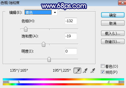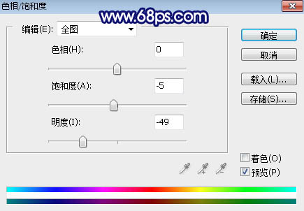15、创建色相/饱和度调整图层,降低全图明度,参数设置如图28,确定后把蒙版填充黑色,然后用柔边白色画笔把底部区域涂暗一点,效果如图29。