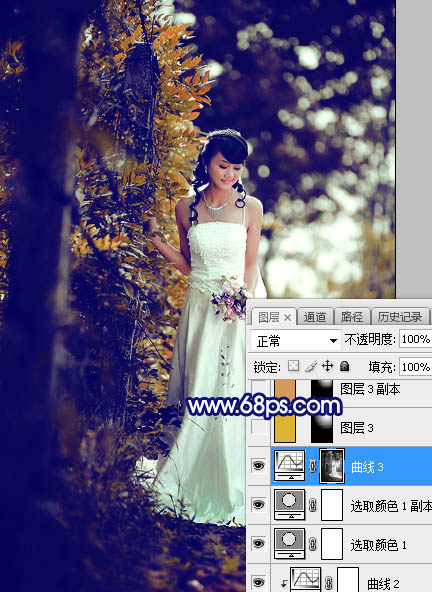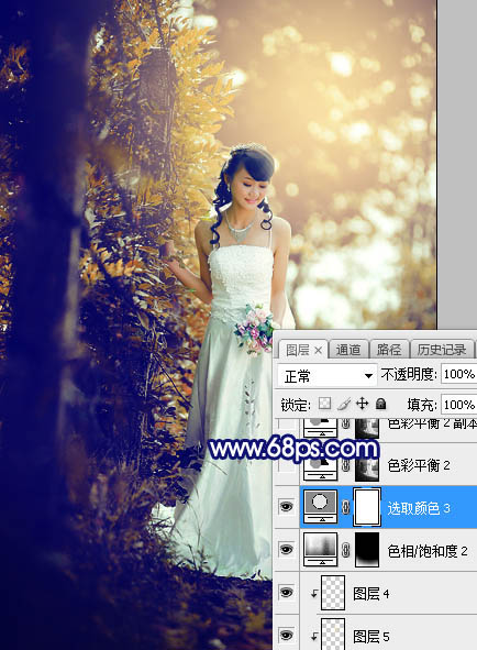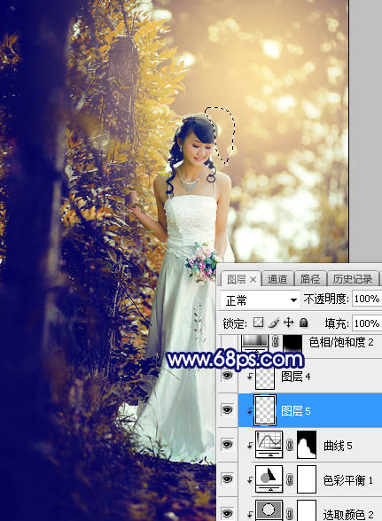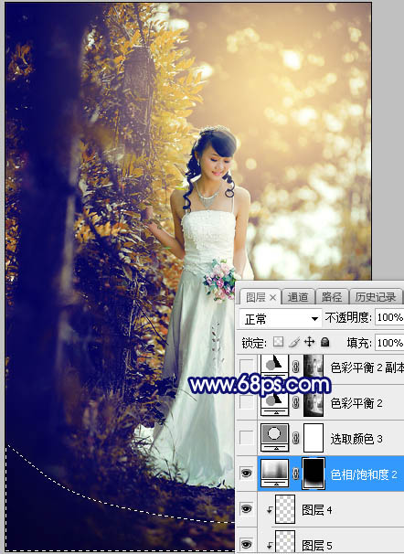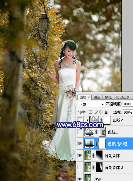 素材图片主色为黄绿色,局部有一点青色;处理的时候直接用色相/饱和度把主色都转为橙黄色;然后把暗部压暗,增加蓝色;再给图片增加一些淡黄色高光即可。