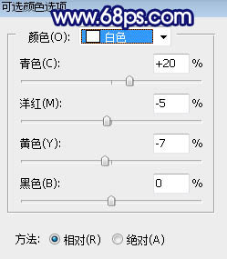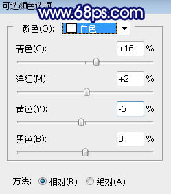 5、创建可选颜色调整图层,对白色,黑色进行调整,参数及效果如下图。这一步给图片高光区域增加淡青色,暗部增加蓝色。