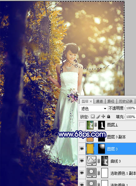 8、创建纯色调整图层,颜色设置为橙黄色:#DEB527,确定后把混合模式改为“滤色”;再把蒙版填充黑色,用透明度为20%左右的柔边白色画笔把下图选区部分涂亮一点。
