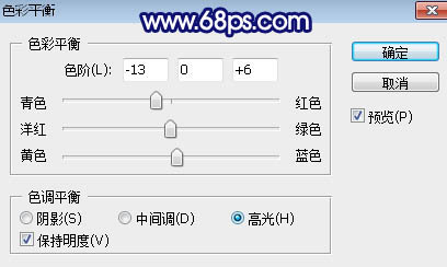 17、按Ctrl + Alt + 2 调出高光选区,然后创建色彩平衡调整图层,对阴影,高光进行调整,参数及效果如下图。这一步给图片高光区域增加淡蓝色。