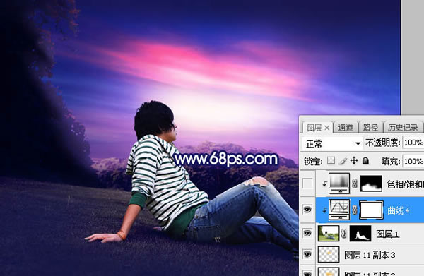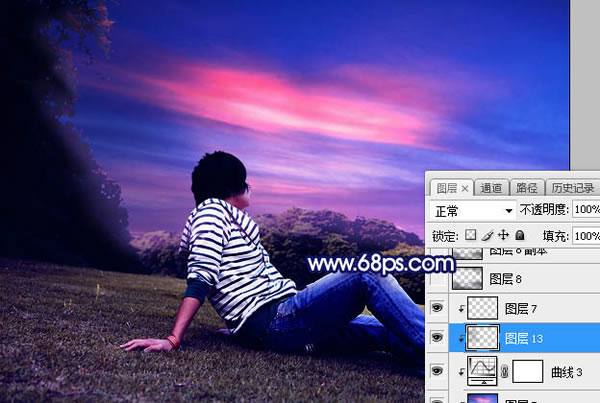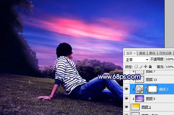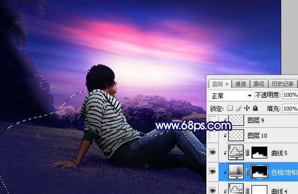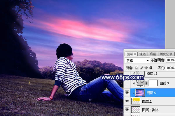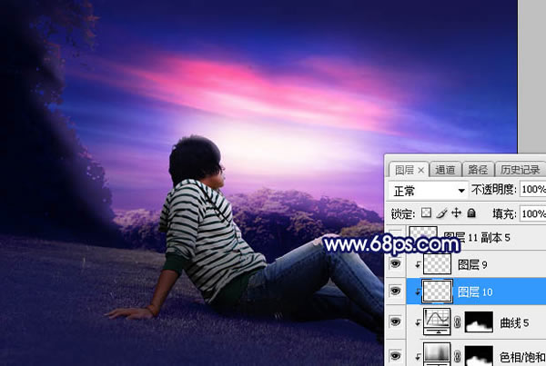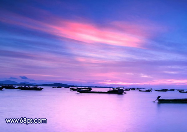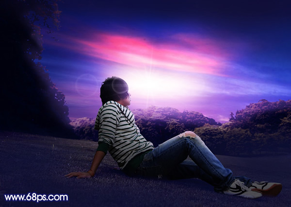 素材图片天空泛白的区域较多,感觉非常空;处理的时候先给天空换上较暗的霞光素材;然后把地面颜色转为暗蓝色,保留一点暖色;最后给图片加上高光,并把边角区域压暗即可。