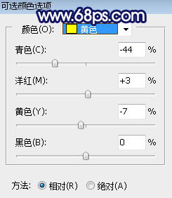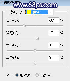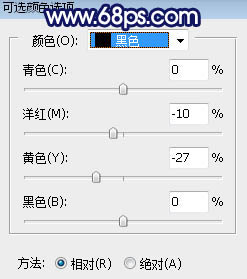 5、创建可选颜色调整图层,对黄色,黑色进行调整,参数设置如图8,9,效果如图10。这一步给图片增加暖色,暗部增加蓝色。