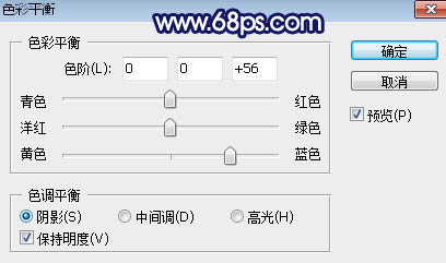 3、创建色彩平衡调整图层,对阴影进行调整,参数设置如图5,效果如图6。这一步给图片暗部增加大量蓝色。