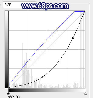 6、按Ctrl + Alt + 2 调出高光选区,按Ctrl + Shift + I 反选得到暗部选区,然后创建曲线调整图层,把RGB通道压暗,再把蓝通道暗部调亮一点,参数及效果如下图。