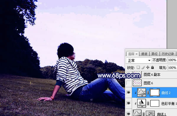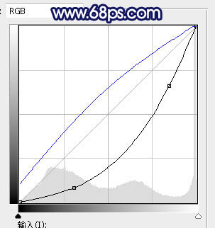 8、创建曲线调整图层,对RGB,蓝通道进行调整,参数设置如图16,确定后创建剪切蒙版,效果如图17。这一步同样把图片暗部压暗,并增加蓝色。