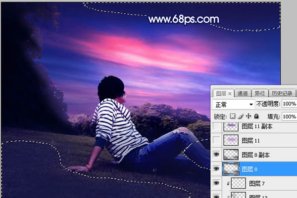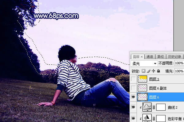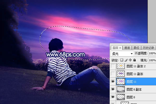 17、新建一个图层,用套索工具勾出下图所示的选区,羽化55个像素后填充紫色:#C18CDA,取消选区后把混合模式改为“柔光”,效果如下图。