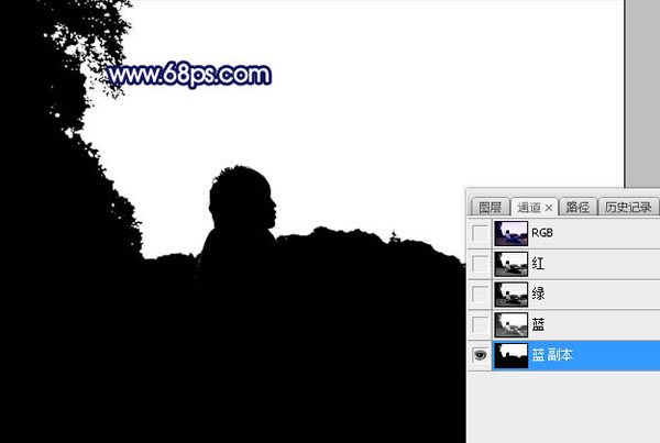 11、新建一个图层,按Ctrl + Alt + Shift + E 盖印图层,进入通道面板,把蓝色通道复制一份,得到蓝副本通道,按Ctrl + L 调整色阶,把天空调亮,其它部分调暗;