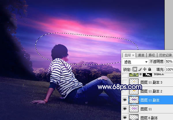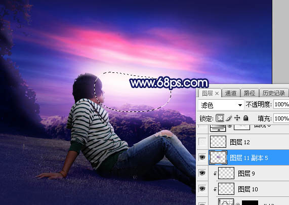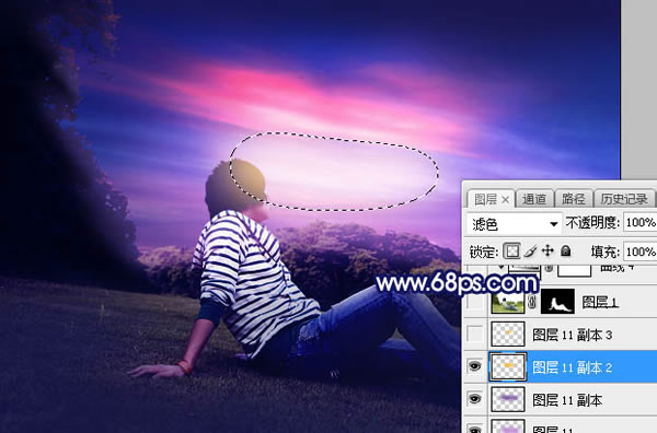 25、新建一个图层,混合模式改为“滤色”,用柔边画笔给下图选区部分涂上紫色高光。