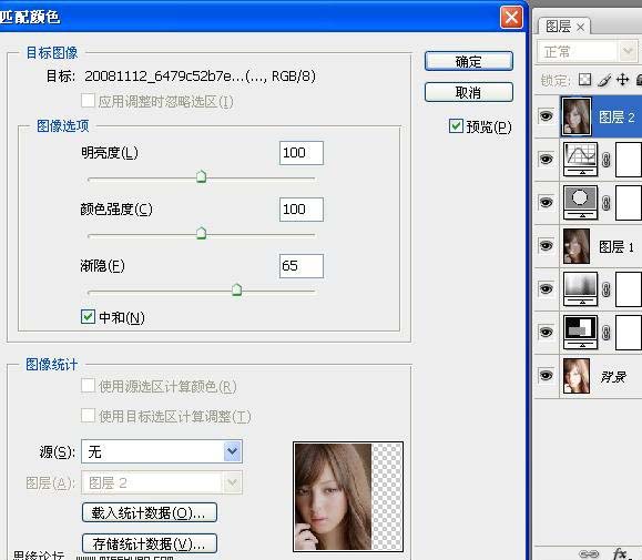 5、盖印可见图层(ctrl+alt+shift+e),匹配颜色,参数如图。