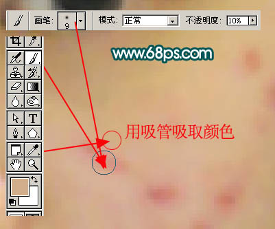 1、打开原图素材,把背景图层复制一层,这一步主要是祛痘,把人物脸部局部放到,选择吸管工具吸取痘痘附近干净肤色如下图红圈位置,吸取后选择画笔工具,选用较小的画笔,不透明度设为:10%,然后在有痘的地方点几下即可消除,不同皮肤上的痘痘需要吸取附近干净肤色再用画笔点掉,大致祛痘后效果如图2。效果看起来不是很舒服,下面还需要磨皮处理。