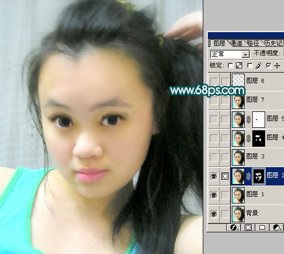 2、新建一个图层,按Ctrl + Alt + Shift + E盖印图层,执行:滤镜 > 模糊 > 高斯模糊,数值为5,确定后按住Alt键加上图层蒙版,然后用白色画笔涂抹皮肤有色块及杂色部分,给人物磨皮,效果如下图。