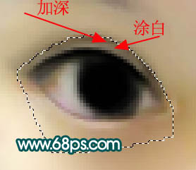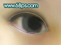 5、这一步来制作双眼皮,方法有很多可以用描边再模糊来制作。本教程的是用加深/减淡工具来制作,先用钢笔工具把眼睛的轮廓勾出来,按Ctrl + Enter转为选区后用加深工具,曝光度为:10%把眼睛内框涂深一点,再用钢笔工具勾出双眼皮的路径,转为选区如图7,双眼皮大致分为三层,选区边缘内部为深色,靠近眼睛部分为高光部分,选区外边缘为深色,涂的时候需要细心涂抹,高光部分用减淡工具涂,涂好后再加上瞳孔的反光,效果如图8。